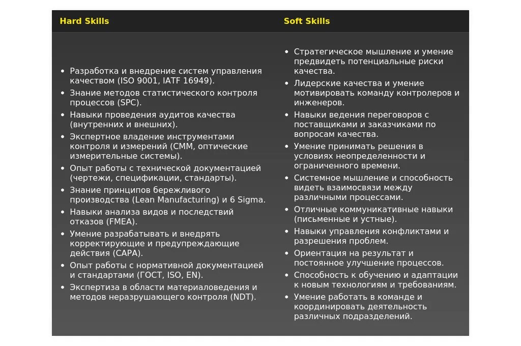 - На какие качества и навыки делать акцент: Внимательность к деталям, аналитический склад ума, знание стандартов качества, умение работать с технической документацией, ответственность, коммуникабельность.