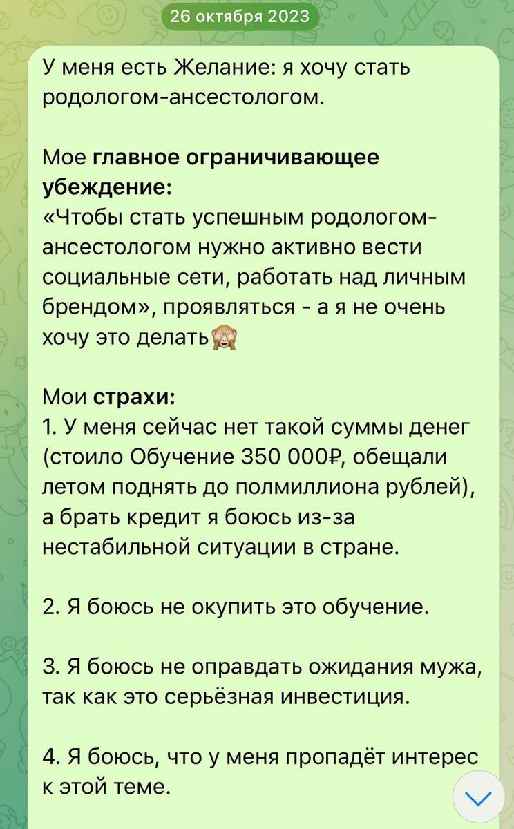 Нашла свою запись от 26 октября 2023 года. Где писала свое желание и препятствия к нему. «Боюсь не оправдать ожидания мужа» - я такая смешная🙈😄 Получается, прошло 1.5 года, я все-таки стала специалистом по Роду (ансестологом), несмотря на мои страхи и ограничивающее убеждение😂 Которое, кстати, вполне обоснованно. ✅Но я работаю над этим: вот уже полгода я ежедневно размещаю посты в своем канале, делюсь своими мыслями, знаниями. Даже один раз сходила на прямой эфир😅😅 Так что, мечтайте,🙏 желания всё-таки сбываются 😉😉😉