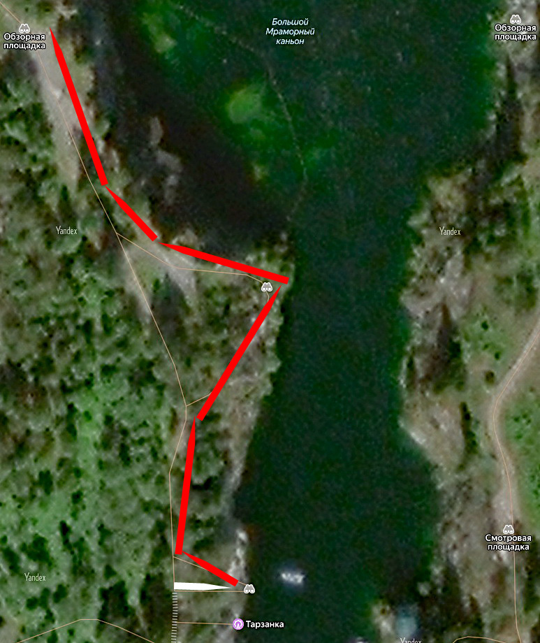 Продолжаем экскурсию вокруг Большого Мраморного каньона. Для удобства (и безопасности) туристов вокруг него проложены пешеходные дорожки. Дорожки, расположенные ближе к краю карьера, сделаны из дерева с надёжным ограждением. На дорожках обустроены обзорные площадки, причём с западной стороны их больше, чем с восточной. В предыдущей статье мы прошли всего около сотни метров и имели возможность полюбоваться красотой каньона с двух площадок. Расстались мы с Вами у обзорной площадки, расположенной около аттракциона «Тарзанка», с видом на живописный скальный уступ на восточном борту карьера. К следующей обзорной площадке (третьей на западе каньона) ведёт широкая гравийная дорожка. Слева – скамейка, на которой можно отдохнуть, справа – вход на обзорную площадку. С этой площадки можно осмотреть только южную часть карьера: на противоположном, восточном борту – «посадочная» площадка для «летающих» туристов аттракциона «Троллей», на юге – причал и Мраморная улица с сувенирными магазинами и кафе.