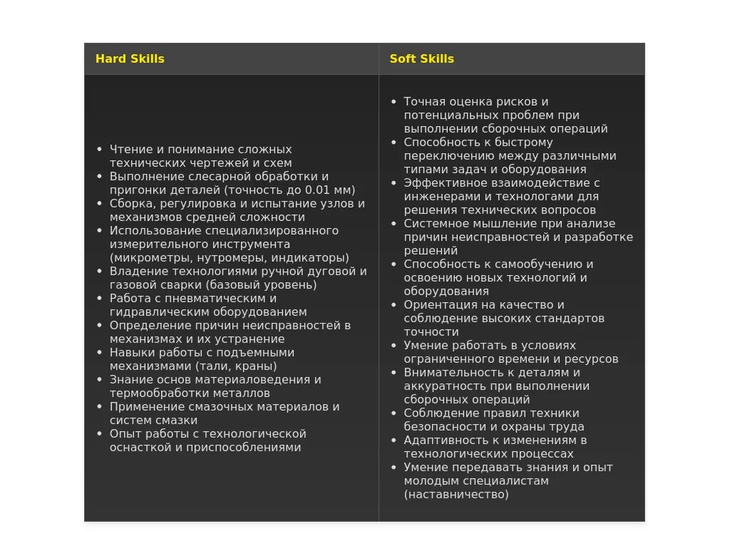 "Ключевые навыки: Сборка узлов и агрегатов, работа с измерительным инструментом (штангенциркуль, микрометр), соблюдение технологической дисциплины. Дополнительные навыки: Чтение чертежей, работа с ручным инструментом, знание допусков и посадок. Личные качества: Ответственность, внимательность к деталям, умение работать в команде."