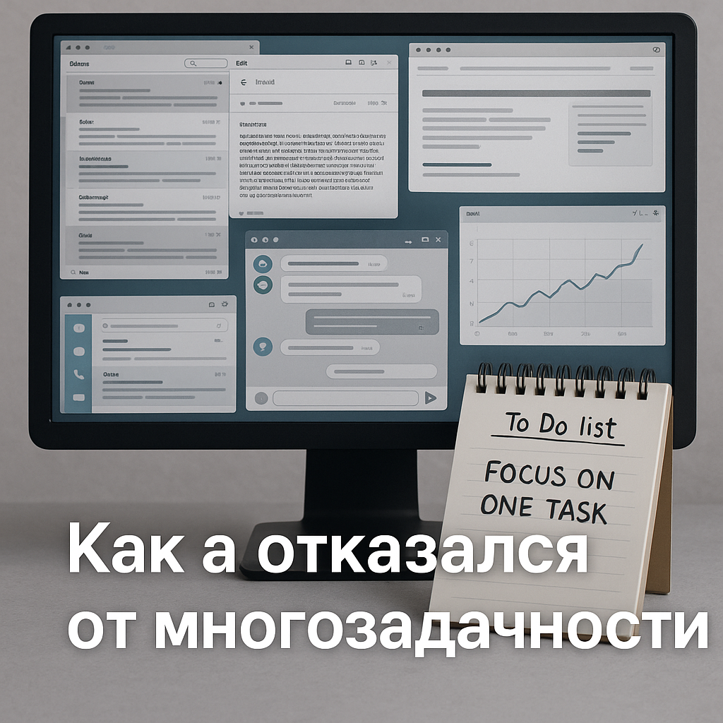 Когда-то я гордился тем, что могу делать несколько дел одновременно. Работать — и переписываться в мессенджерах. Слушать подкаст — и отвечать на письма. Смотреть сериал — и пролистывать ленту новостей. Казалось, я “максимально эффективен”. Но на деле — я стал уставшим, рассеянным и раздражённым. И вдруг понял: моя многозадачность не ускоряет меня, а разрывает. Как я жил в режиме “всё сразу” Я постоянно переключался. Чекал уведомления, отвлекался на звонки, начинал новое, не закончив предыдущее. Было ощущение, что я занят 24/7 — но в итоге почти ничего не доводил до конца. К концу дня в голове — шум. В теле — напряжение. В списке задач — куча незавершённого. И чувство вины, что опять “не успел”. Что происходило с вниманием и качеством Я стал замечать: внимание будто “распылено”. Пропускаю детали, делаю ошибки. Общение с близкими — на автомате. Работа — на уровне “лишь бы сдать”. Многозадачность создавала иллюзию продуктивности, но на деле я тратил больше времени и энергии на пер