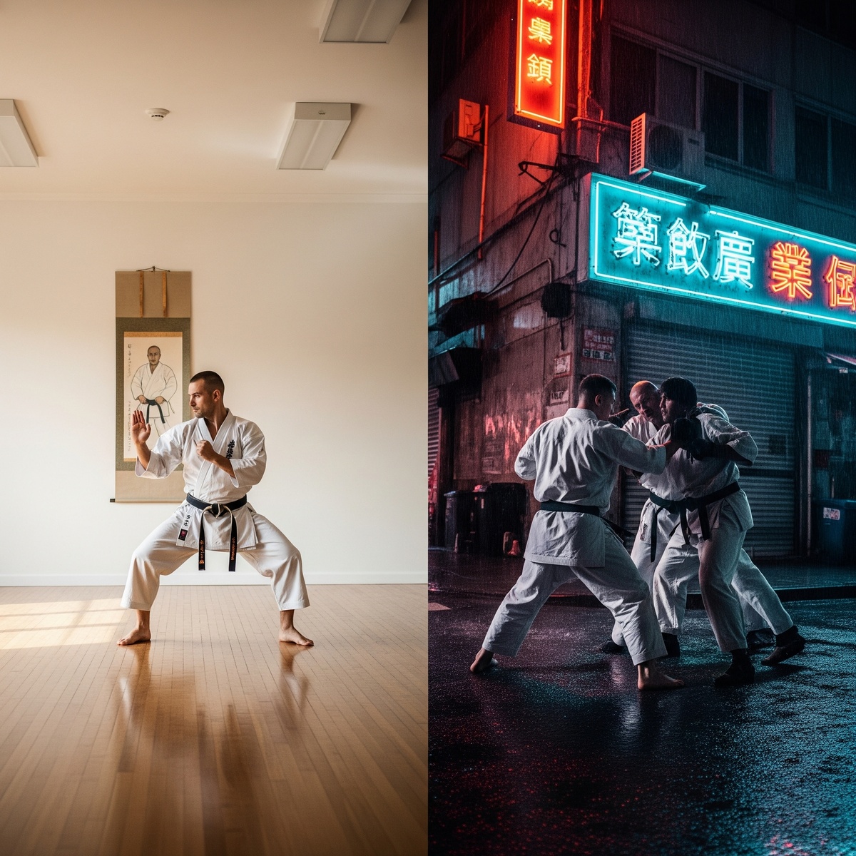 Представьте себе бойца, который провёл тысячи часов, оттачивая ката, практикуя тамэсивари, вбивая в себя убеждение, что его удары способны сокрушать кости и мгновенно останавливать противника. Он привык к уважению со стороны соучеников, к почтительному отношению младших, к авторитету своего сэнсэя. Он убеждён в своей силе и неуязвимости. И вот он оказывается на улице, в ситуации реальной угрозы, где его противник не соблюдает никаких правил. Противник может быть пьян, может напасть со спины, может использовать нож или камень, может просто схватить и начать бороться, не давая пространства для красивых ударов. В этот момент весь отточенный арсенал каратэ, рассчитанный на определённую дистанцию и правила, становится бесполезным.