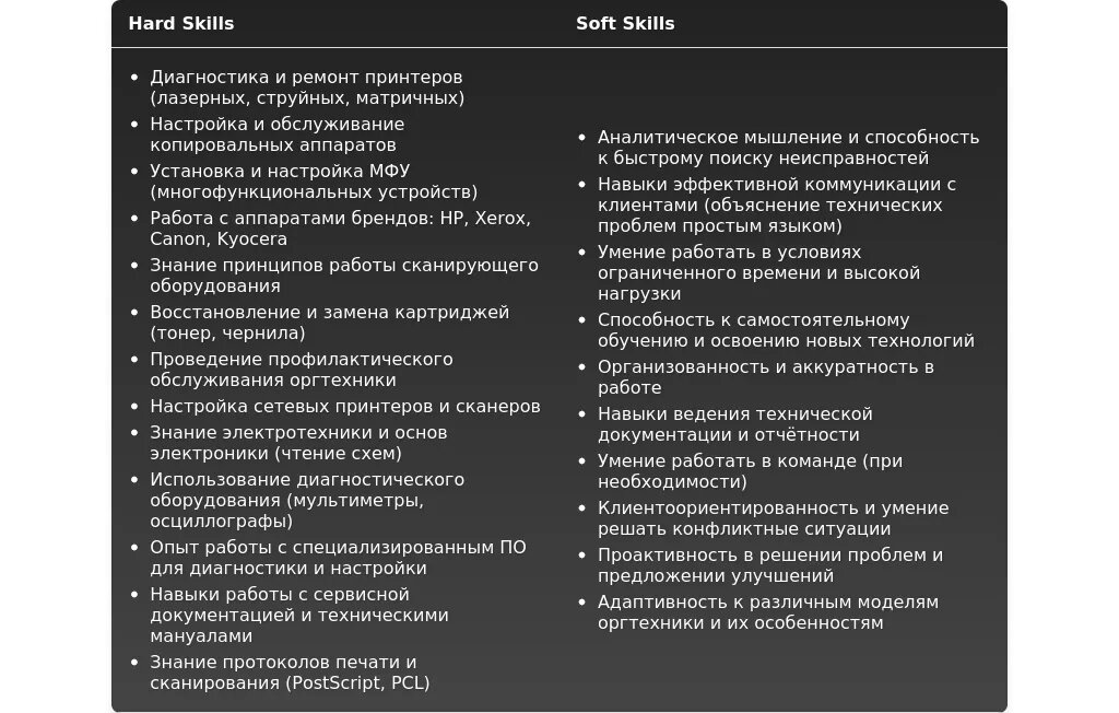 Анализ: Обязательные требования – опыт работы, знание конкретных моделей принтеров, умение проводить диагностику и ремонт. Желательные требования не указаны. Скрытых требований нет.