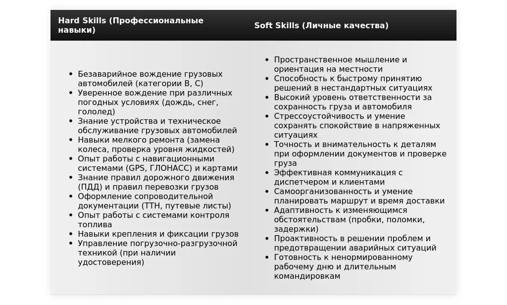 Ключевые навыки (безаварийное вождение, знание ПДД, опыт работы с документацией).
