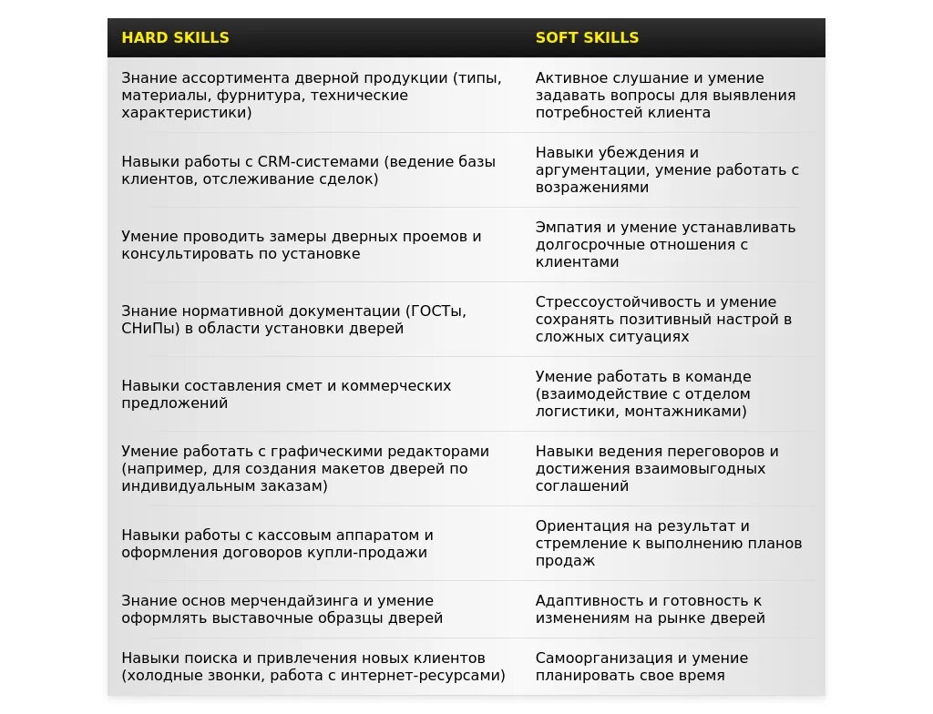 После: "Навыки продаж: Ведение переговоров, работа с возражениями, заключение договоров. Технические навыки: Знание рынка дверей, работа с CRM-системами (Bitrix24, AmoCRM). Личные качества: Коммуникабельность, ответственность, нацеленность на результат."