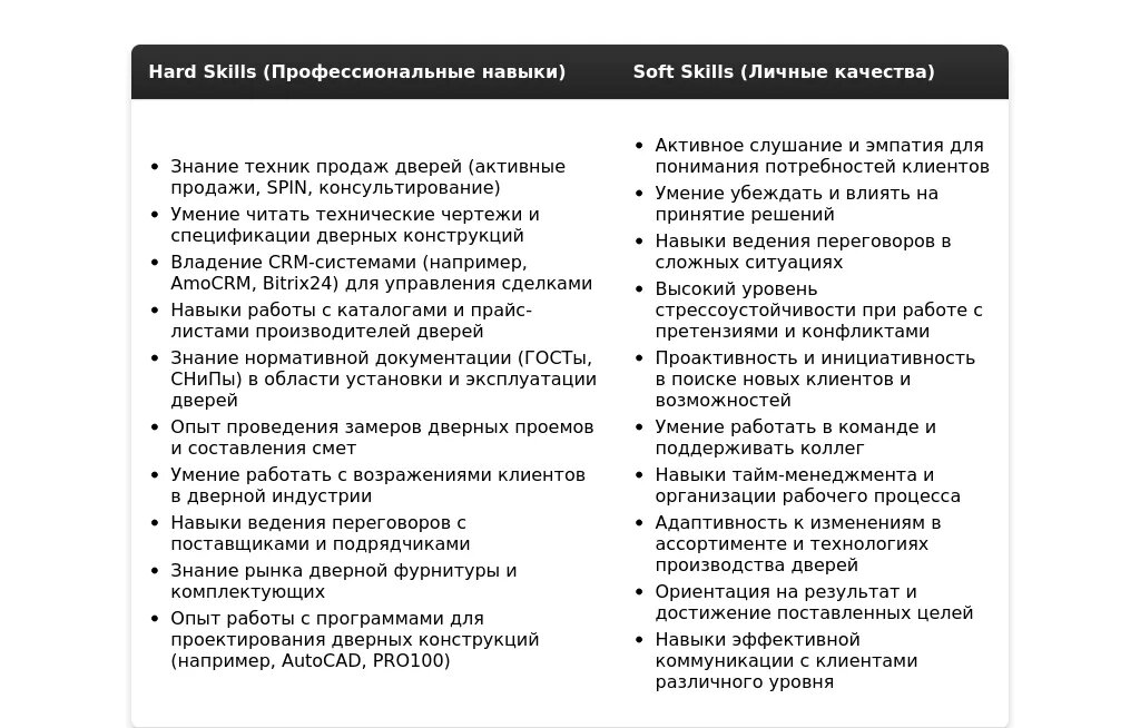 Ключевые навыки и компетенции, важные для менеджера по продажам дверей (например, навыки переговоров, знание техник продаж, умение работать с возражениями, знание рынка дверей).