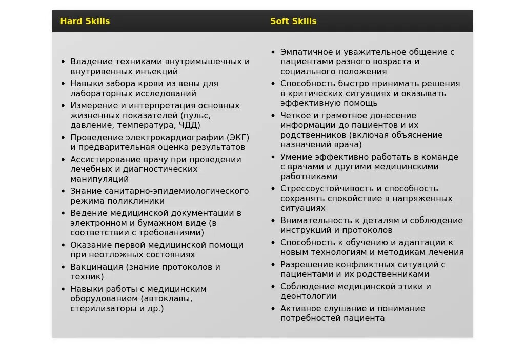 Коммуникабельность, ответственность, знание ПК, медицинские манипуляции.