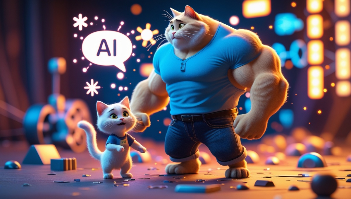 "Pixar-style 3D render of a muscular white father cat with a blue T-shirt and black jeans, and his small white kitten. Both stand on their hind legs." Leonardo.ai выдал отличные варианты. Я немного поигрался с стилем и получил нужную атмосферу. ⚙️ Альтернатива: можно использовать Midjourney, если больше нравится их стиль. После визуалов я захотел добавить голос. Использовал