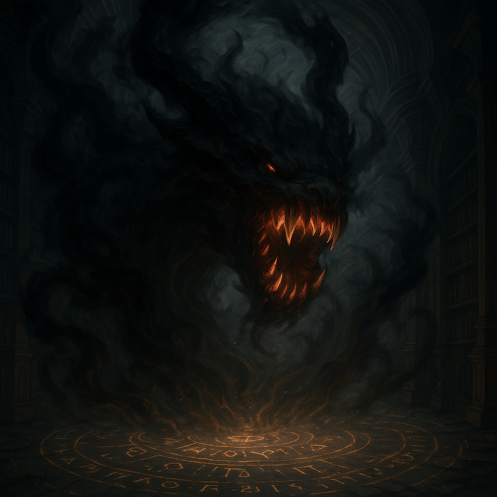 Лур-Моракс не видим. Он ощущается как трещина в мировом зеркале. Его приход не громок, но не может быть пропущен. Волна гнили и холода опускается на стены, и воздух сгущается, как перед бурей из иного мира. Вибрация под ногами становится не земной — она идёт из рун, вырезанных на костях Библиотеки. В этот миг сами стены пульсируют, как живое существо, изрыгающее страх. Книги дрожат, шелестят своими заклинаниями, прячутся в тени полок. Некоторые сами загораются, вспыхивая и исчезая, словно надеясь, что пепел не привлечёт взгляда зверя.