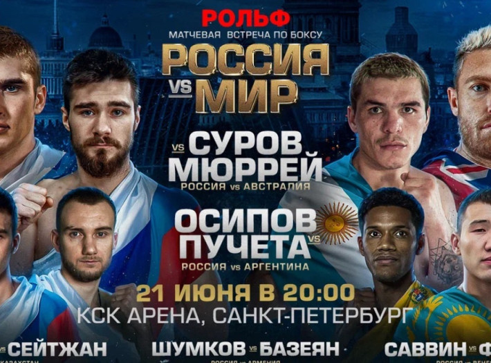 21 июня в Санкт-Петербурге состоится матчевая встреча по боксу между сборной России и сборной Мира в рамках Петербургского экономического форума. Сборную России представят чемпион Европы, а также трёхкратный чемпион России Эдуард Саввин, чемпион мира IBA PRO, чемпион Европы, бронзовый призёр чемпионата мира, трёхкратный чемпион России Всеволод Шумков, победитель первенства России, бронзовый призёр чемпионата и Кубка страны, победитель международных турниров Александр Зырянов, серебряный и двукратный бронзовый призёр чемпионата России, победитель Всероссийской спартакиады, победитель и призёр международных и всероссийских турниров Юрий Осипов и действующий чемпион и обладатель кубка России Давид Суров. Стоит отметить, что Шумков 14 июня в Екатеринбурге проведёт бой против африканца Рилвана Лаваля, а уже спустя неделю выступит на этом турнире в бою против серебряного призёра чемпионата Европы, победителя первенства Старого Света и чемпиона Армении Артура Базеяна. Саввину предстоит сразит