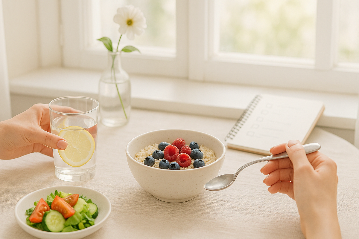 Но без жёстких диет и насилия над собой? Есть способ проще — и он реально работает. Собрала для тебя 7 проверенных правил питания. Без крайностей, без марафонов «всё или ничего». Просто то, что помогает телу проснуться, энергии — прибавиться, а голове — не срываться на шоколадку в стресс. Начнём? Но не зря — она правда важна. Ускоряет обмен веществ, помогает телу очищаться, влияет даже на состояние кожи. Как вписать в день: поставь бутылку воды рядом на стол, налей стакан перед каждым приёмом пищи, включи напоминалки. Заметишь: через пару дней станет легче просыпаться, появится бодрость, меньше тянет на сладкое. Утренний приём пищи запускает обмен веществ и помогает держать аппетит под контролем весь день. Если не хочется есть: пусть это будет что-то лёгкое — йогурт, банан, овсянка в банке с вечера. Главное — не скипать совсем. Бонус: меньше соблазнов перекусить чем-то вредным после обеда. Не ради галочки, а потому что это — витамины, клетчатка и здоровье твоего кишечника. Лайфхаки: ов
