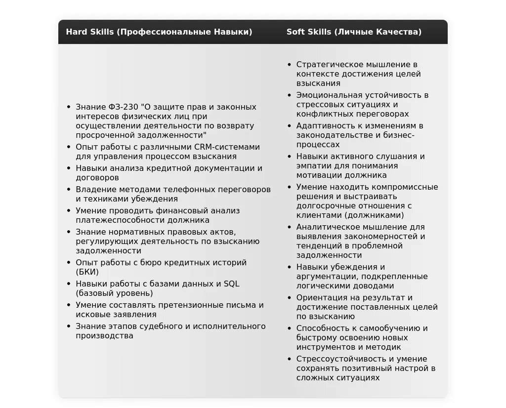 - Ключевые навыки: Добавьте ключевые навыки, которые важны для работы в сфере взыскания, например, "Ведение переговоров", "Работа с базами данных" или "Знание законодательства".