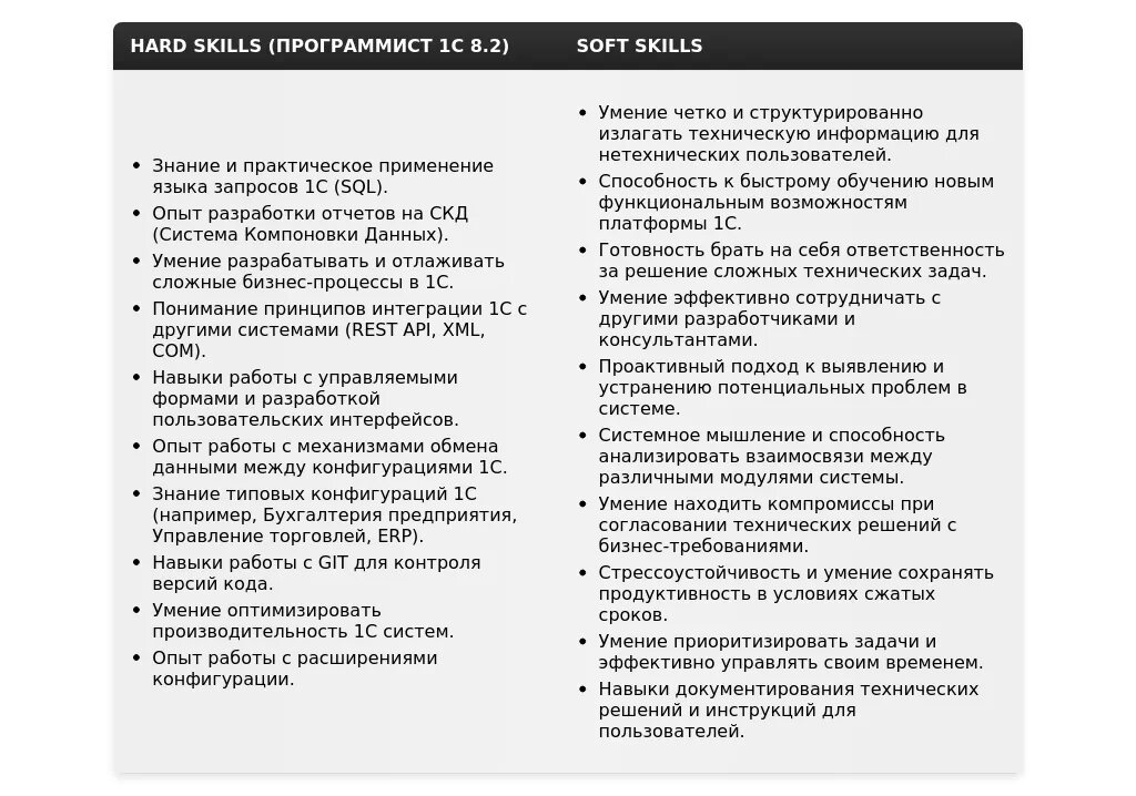 Анализ: Обязательным является опыт разработки на 1С и знание УТ 11. Важно акцентировать внимание на опыте разработки отчетов и обменов данными. Скрытое требование – знание торгового учета.
