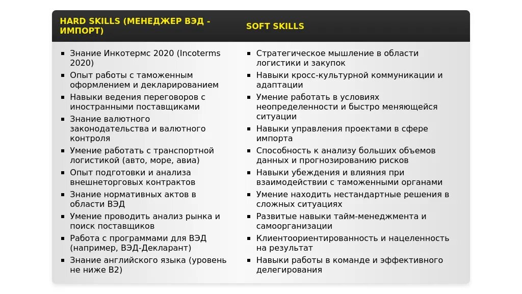 - Профессиональные навыки: Знание таможенного законодательства, опыт ведения переговоров, знание Incoterms.