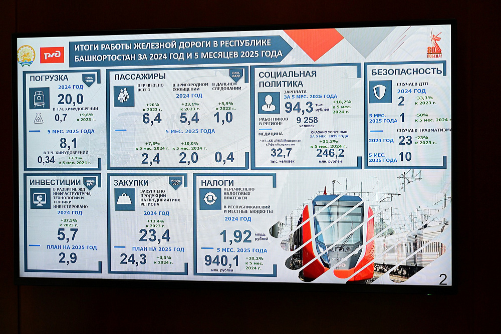 3 июня в Доме Республики Глава Башкортостана Радий Хабиров встретился с начальником Куйбышевской железной дороги – филиала ОАО «РЖД» Вячеславом Дмитриевым. На повестке – перспективы развития пассажирского транспорта и грузовых перевозок, а также модернизация железнодорожной инфраструктуры на территории региона. Глава республики высоко оценил эффективность взаимодействия с Российскими железными дорогами. – У нас с вами выстроена системная работа. Плодотворно сотрудничаем с компанией в части развития пассажирских и грузоперевозок, модернизации подвижного состава. Это очень важно для региона, повышения комфорта наших жителей, – сказал Радий Хабиров. – Запуск Южного, Западного, Восточного экспрессов создаёт новые возможности для повышения мобильности населения и развития туризма. Начальник Куйбышевской железной дороги отметил хорошую динамику показателей работы филиала. В частности, объём пассажирских перевозок по итогам 2024 года вырос на 20 процентов по сравнению с показателем 2023 года