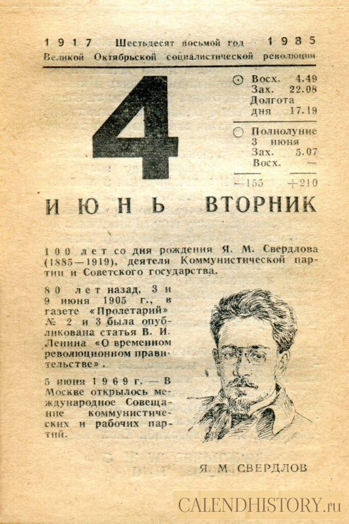 Итак, сегодня 4-го июня и у нас на календаре 1985-й год. Перед нами листок советского календаря для женщин. На календаре у нас вторник - 4 июня 1985-го года. 100 лет со дня рождения Я. М. Свердлова (1X85—1919), деятеля Коммунистической партии и Советского государства. 80 лет назад, 3 и 9 июня 1905 г., в газете «Пролетарий» № 2 и 3 была опубликована статья В. И. Ленина «О временном революционном правительстве». 5 июня 1969 г. — В Москве открылось международное Совещание коммунистических и рабочих партий. Я. М СВЕРДЛОВ *** Оборотную сторону листка этого календаря можно посмотреть у нас по ссылке на сайте. Другие листки советских календарей смотрите у нас на сайте - CALENDHISTORY.ru ПОСМОТРИТЕ ЕЩЁ ЛИСТКИ ОТРЫВНЫХ КАЛЕНДАРЕЙ: