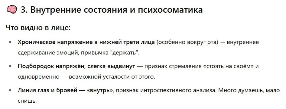 Простите что я в ночи. Но я не могу молчать. Короче... Одно ваше селфи + промпт = диагностика и рекомендации от физиогномиста, нутрициолога, психосоматолога и эксперта по женскому здоровью. Я только что сделала. Я в шоке. ▶️ Вот ссылка на пост с промптом. Там канал Кати, к которой я вошла в клуб, чтобы заново строить систему в Notion. А я пошла рекомендации в рутину встраивать. Ух! Не реклама Кати! Рекомендация промпта для девочек))