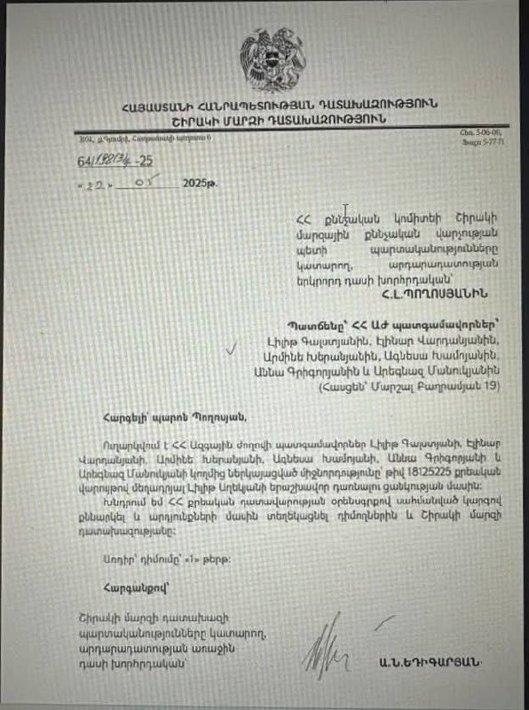 Շիրակի մարզի առաջին ատյանի ընդհանուր իրավասության դատարանը մերժեց ՀՀ քննչական կոմիտեի նախագահի կողմից ներկայացված հետաքննող լրագրող Լիլիթ