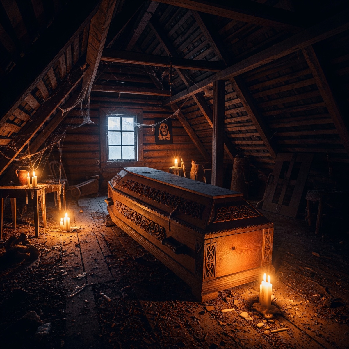 Мы не решились его трогать в тот день. Спустились вниз, пытаясь отогнать непрошеные мысли. Но дом словно изменился. Тишина в нем стала напряженной, звенящей. Каждый скрип половицы, каждый шорох за стеной казался теперь предвестием чего-то жуткого. А ночью мне приснился сон: я снова на чердаке, стою перед гробом, и изнутри доносится тихий, едва слышный вздох. И шепот, зовущий меня по имени.