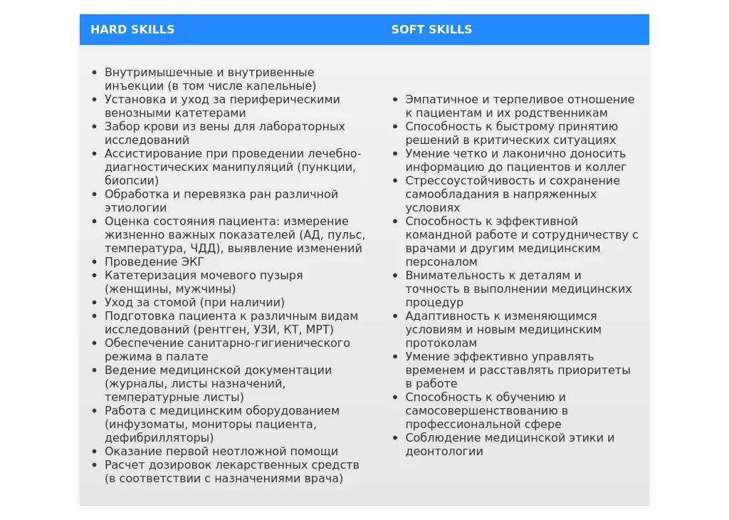 - Практические навыки: Навыки проведения инъекций, перевязок, измерения жизненно важных показателей, ухода за пациентами.