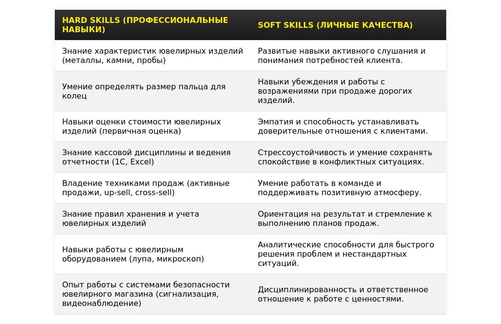 "Продажи и обслуживание: *Активные продажи*, *Выявление потребностей клиентов*, *Персональные консультации по ювелирным изделиям*, *Работа с кассовым аппаратом*. Коммуникативные навыки: *Убеждение и аргументация*, *Работа с возражениями*, *Поддержание долгосрочных отношений с клиентами*. Технические навыки: *Уверенный пользователь ПК*, *Работа с 1С:Предприятие (базовый уровень)*."