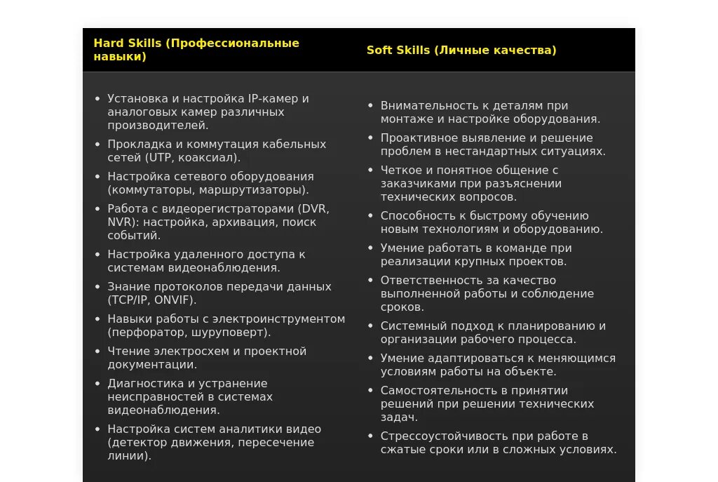 Анализ: Здесь важен опыт работы на крупных объектах и техническое образование. Подчеркните знание протоколов передачи данных и опыт работы с IP-камерами. Обязательно укажите, что умеете читать проектную документацию.