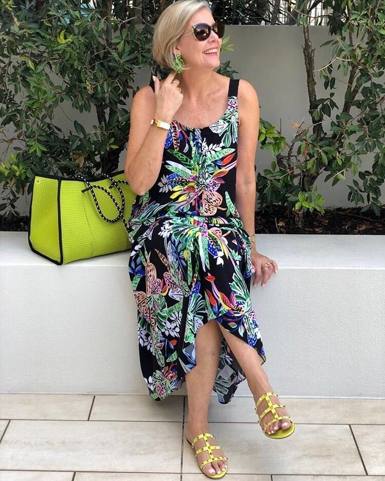 Платье с насыщенным растительно-цветочным принтом – вещь привлекательная, ее можно смело назвать классикой летнего гардероба, который обычно хорошо смотрится на дамах зрелого возраста. Однако есть одна деталь: платье темное с яркими растительными рисунками визуально добавляет возраста. Другие проблемные варианты таких моделей – слишком мелкий принт, из-за которого фигура кажется более крупной, и излишняя фотореалистичность, например, фотопечать, не слишком хорошо выглядящая на женщинах 50+. Устоявшийся стереотип, который гласит, что темный цвет стройнит, берется на вооружение многими зрелыми женщинами, однако им очень важно помнить, что темные платья в растительный принт могут не только не улучшить, но и усугубить положение.