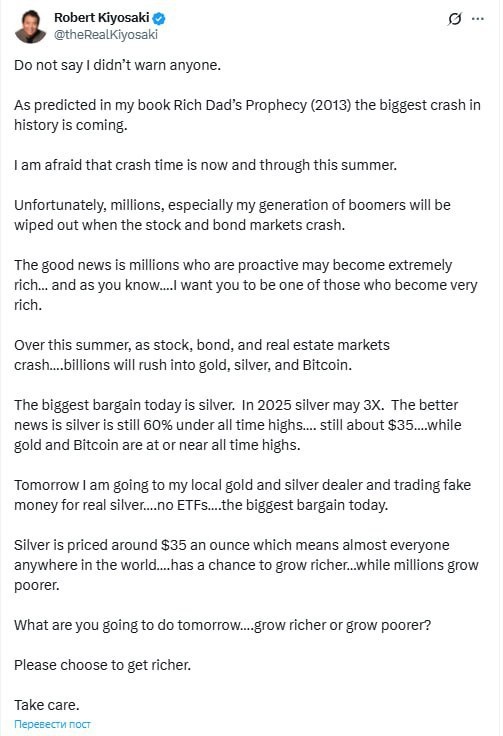 Кийосаки предупреждает, что миллионы людей могут понести серьёзные потери, особенно представители поколения бумеров, чьи сбережения чаще всего завязаны на акциях и недвижимости.