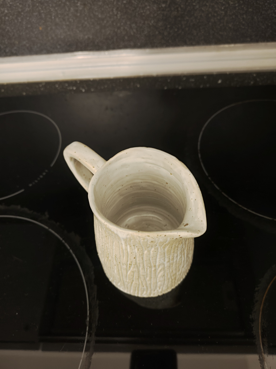 Это маленький кувшинчик. Изначально просто бесцельный кувшинчик. Хотелось бы написать, что это изделие из серии в активной эксплуатации, но это изделие ниразу не было использовано, человеком, у которого оно сейчас. Он просто стоит на кухне на столешнице рядом с заварочным чайником. Немного о технике Изделие по сути сделано из так называемых пластов, без гончарного круга. Обычно пластовая техника применяется для изготовления крупных изделий (например раковина, статуя). В этой технологии по сути берутся отдельные куски и соединяются между собой. Места соединения предварительно процарапывются на обоих пластах. Потом царапки покрываются шликером (жидкая глина, суспензия на основе глины). По сути шликер у многих керамистов - это остатки осечённой, срезанной глины, которые скинуты в воду + сама вода, в которой омываются руки. В воде оседает глиняная взвесь, которая по сути и играет роль шликера. Царапки + шликер для пластов глины работают как клей. Помимо крупных изделий пласты применяются д