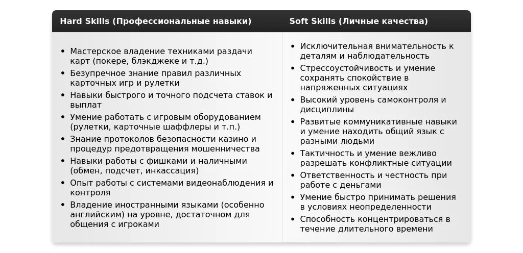 "До:"Коммуникабельность, ответственность, внимательность."После:"Ключевые навыки:Свободное владение правилами покера, рулетки и блэкджека.