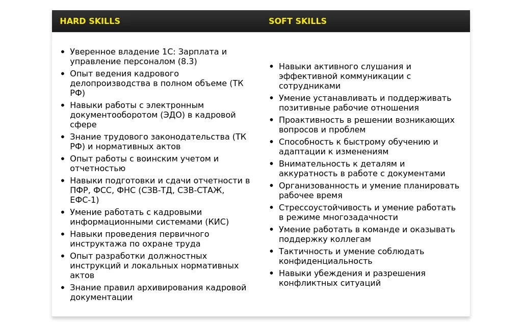 - Для вакансий в IT-компаниях: "Опыт работы с СЭД", "Опыт автоматизации кадровых процессов", "Знание современных HR-технологий".
