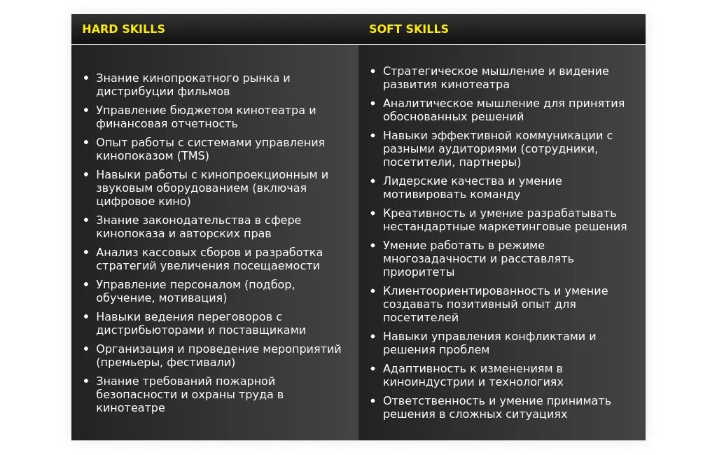 Ключевые навыки и компетенции, релевантные должности директора кинотеатра.