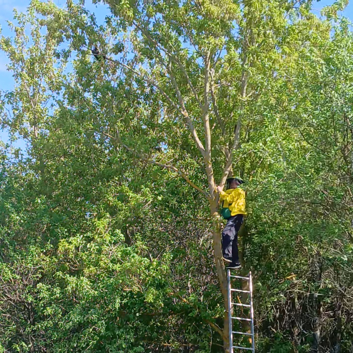 3. **Контролируемый спуск** – Осторожно опускаете ветку с пчелами вниз, используя срезанные ответвления как держатели.
