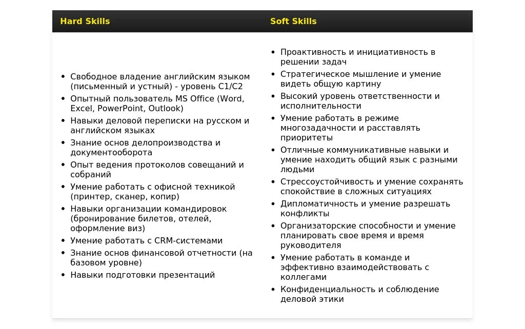 - На какие качества и навыки делать акцент: Отличные коммуникативные навыки (особенно на английском языке), организаторские способности, умение работать с информацией, знание офисных программ, ответственность и исполнительность.