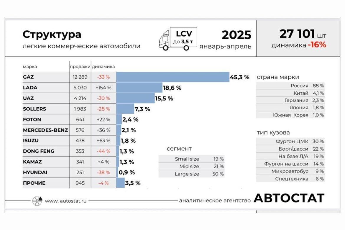 Аналитическое агентство «Автостат» опубликовало данные о структуре российского рынка новых лёгких коммерческих автомобилей (LCV до 3,5 т) в январе-апреле 2025 года. Как сообщил в своём телеграм-канале директор агентства Сергей Целиков, за указанный период рынок новых LCV составил 27 101 единицу. Результат оказался на 16% меньше, чем за первые четыре месяца прошлого года. «Доля российской техники на рынке LCV бьёт все рекорды — 88%. Китай в данном сегменте российского авторынка занимает лишь чуть больше 4%. Удивительно, но факт», — отметил С. Целиков. В «тройке» лидеров в сегменте LCV — ГАЗ (12 289 реализованных экземпляров, доля — 45,3%), Lada (5030 шт.; 18,6%) и УАЗ (4214 шт.; 15,5%). В топ-5 также попали Sollers (1983 шт.; 7,3%) и Foton (641 шт.; 2,4%). На цельнометаллические фургоны приходится 30% продаж LCV, а на бортовые версии — чуть больше 20%, резюмировал директор «Автостата». Фото: журнал «Движок», агентство «Автостат»