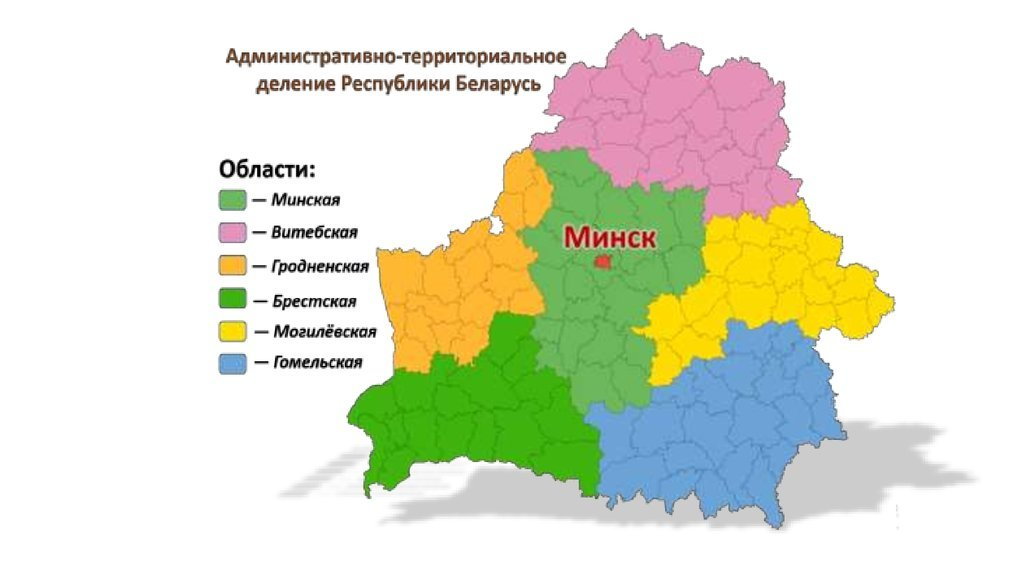 Государство подразделяется на шесть областей, которые, в свою очередь, делятся на районы и города областного подчинения. Общее число районов во всех областях составляет 118, а городов областного подчинения — 10. Город Минск является отдельной административно-территориальное единицей Республики Беларусь и имеет особый статус города республиканского подчинения. Вот именно об административном делении Беларуси и пойдёт речь в моей сегодняшней статье.