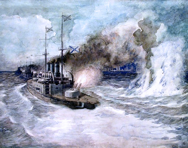 прожектором свои позывные "GB". Еще раньше об обнаружении германского линейного крейсера просигнализировал находящийся в воздухе гидросамолет с "Александра I", но поскольку свод сигналов дымками не давал возможности указать при этом пеленга, сообщение не позволяло определить направление на германский корабль. Получив радиограмму с крейсера в 7.05 Эбергард приказал группе обстрела немедленно присоединиться к эскадре, а сам пошел им навстречу. Однако "Гебен" быстро настигал его, и стало ясно, что соединиться русские броненосцы не успеют. В момент получения сигнала командующего о возвращении к флоту отряд князя Путятина находился примерно в 95 кабельтовых севернее мыса Эльмас, не успев еще лечь на боевой курс для обстрела береговых батарей. В 07.10 тральщики, а за ними линкоры начали последовательно разворачиваться через левый борт в узкой протраленной полосе. Маневр занял 18 минут, поэтому князь вынужден был еще до выхода на безопасные глубины обогнать тральщики и самым полным ходом идти на соединение с "Евстафием".