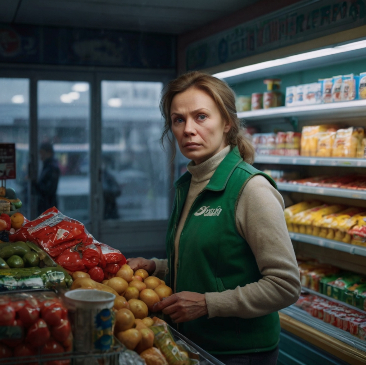 Морозный февральский вечер. Витрина «Пятёрочки» запотела от дыхания спешащих за хлебом и молоком людей. Марина, в зелёном жилете с потёртым логотипом, переставляла банки с консервами, стараясь не смотреть на часы. Руки ныли от картонных коробок, оставляющих на коже красные царапины.