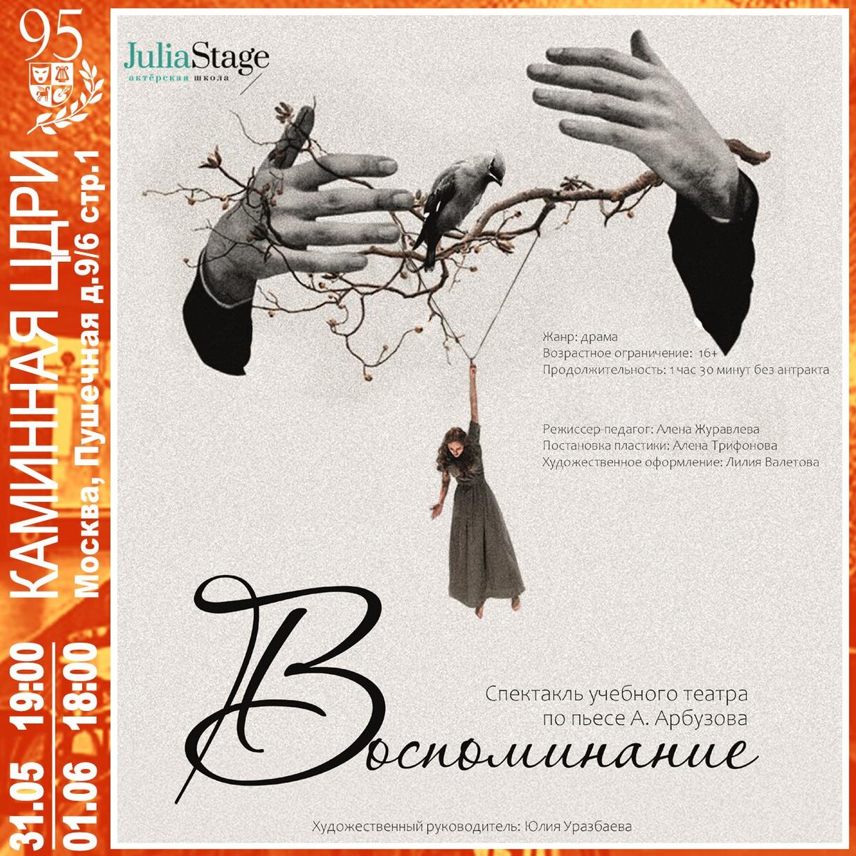 Спектакль учебного театра студии JuliaStage Каждый человек хочет быть Любим. Спектакль «Воспоминание» по одноименной пьесе Алексея Арбузова — это пронзительное погружение в мир человеческих отношений, где прошлое переплетается с настоящим, а любовь предстает во всей своей хрупкой и ускользающей красоте. С каждым новым эпизодом становится очевидно, насколько уязвима и хрупка человеческая любовь. Одно неосторожное слово, один неверный поступок, одно упущенное мгновение могут разрушить даже самые крепкие узы. Спектакль заставляет задуматься о ценности каждого мгновения, проведенного рядом с любимым человеком, о важности умения прощать и понимать, о необходимости беречь те чувства, которые делают нашу жизнь по-настоящему наполненной и осмысленной. «Воспоминание» — это не просто история любви, это размышление о времени, о памяти, о том, что остается с нами, когда все уходит. Это спектакль, который заставляет зри