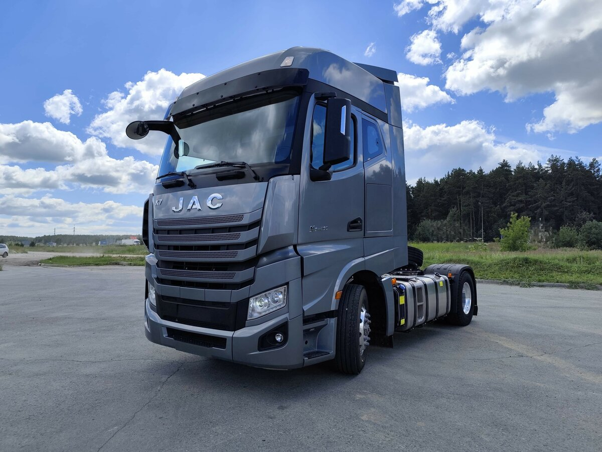 JAC K7 представляет современный седельный тягач с надежным 6-цилиндровым турбодизелем Cummins мощностью 490 л.с. и крутящим моментом 2300 Н·м. Двигатель зарекомендовал себя как проверенный временем агрегат, работающий на различных машинах многие годы. Кабина выполнена по европейским стандартам с узнаваемым хромированным логотипом JAC. Конструкция базируется на платформе Mercedes Actros, что обеспечивает высокое качество сборки. Двухуровневые воздухозаборники расположены по бокам и возле фар со светодиодным ближним светом и ходовыми огнями. Удобные откидные ступеньки позволяют легко добраться до лобового стекла для обслуживания. Мощные зеркала выполнены в едином корпусе с двойными секциями, что минимизирует загрязнение и обледенение. Передняя подвеска представлена простой и надежной балкой на двухлистовой рессоре с мокрыми ступицами, снижающими сопротивление качению. Автомобиль оснащен двумя алюминиевыми баками общим объемом 1200 литров: основной на 800 л и вспомогательный на 400 л. Сис