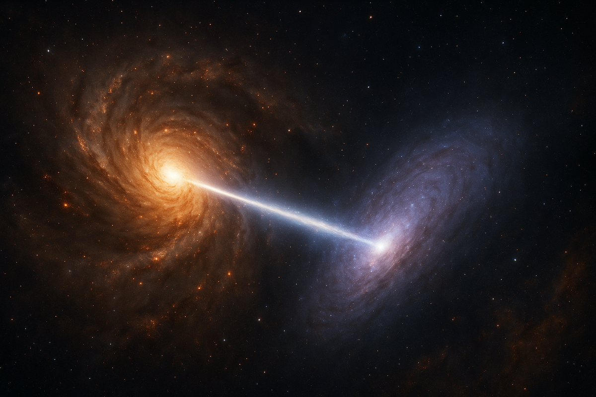 В глубинах Вселенной, на расстоянии более 11 миллиардов световых лет от нас, разворачивается событие, от которого трудно отвести взгляд. Две галактики столкнулись — не буквально, как два тела, а в гораздо более сложной, энергетически насыщенной форме. Одна пронзает другую мощным лучом радиации, испуская его из активного квазара в своём ядре. Это не метафора. Это физическая реальность, зафиксированная с уникальной точностью международной командой учёных при помощи телескопов ALMA и VLT. И речь идёт не просто о взаимодействии. Это — агрессия. Уничтожение. Превосходство, которое работает буквально как оружие. Квазар — это сверхмощный источник энергии, формирующийся в центре галактики вокруг сверхмассивной чёрной дыры. Он излучает колоссальные объёмы энергии, поглощая окружающий газ и порождая лучи, способные пронизывать межгалактическое пространство. В этом случае луч квазара буквально пробивает соседнюю галактику. Удар приходится по её газовым облакам — тому самому материалу, из которого