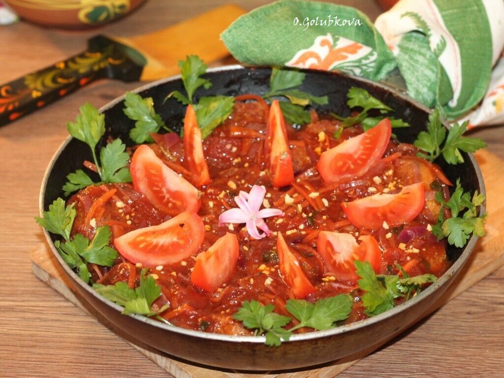 13. Поставьте сковороду в разогретую до 180 С духовку, минут на 15-20, а затем подавайте к столу. Посыпьте блюдо порубленной зеленью и украсьте дольками помидора.