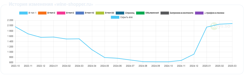 В марте 2025 года в топ-1 вышло по профильной алкогольной тематике 2079 запросов. И это в 3,2 раза больше (в сентябре 2024 года было 633 запроса). Мы видим ниже на графике явное проседание и заметный рост после работы, проведенной нашей командой.