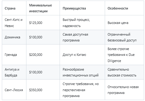 - Антигуа и Барбуда: Предлагает различные варианты инвестиций, включая недвижимость, бизнес и пожертвование.