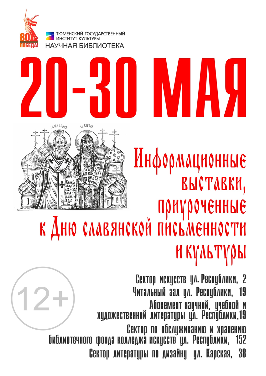 20 мая во всех структурных подразделениях научной библиотеки ТГИК открылись информационные выставки, приуроченные к Дню славянской письменности и культуры (24 мая). 24 мая для всех славянских стран является праздником привнесения на наши земли письменности, создания богатой книгописной культуры и отечественной словесности – днем почитания святых просветителей Кирилла и Мефодия. Какую бы науку мы не постигали, глубину какого бы литературного произведения, и стремились постичь эти знания на нашем родном языке – все это является отголоском великого наследия, которое оставили нам создатели славянской письменности. Еще в далеком ХI веке двое православных монахов, Кирилл и Мефодий, прибыли на наши земли из Константинополя в качестве проповедников-просветителей. Их стараниями был создан славянский алфавит, получивший название «кириллицы» в честь одного из братьев, а также переведены Псалтирь, Евангелие и другие тексты для православных богослужений. С тех пор началось интенсивное развитие сл