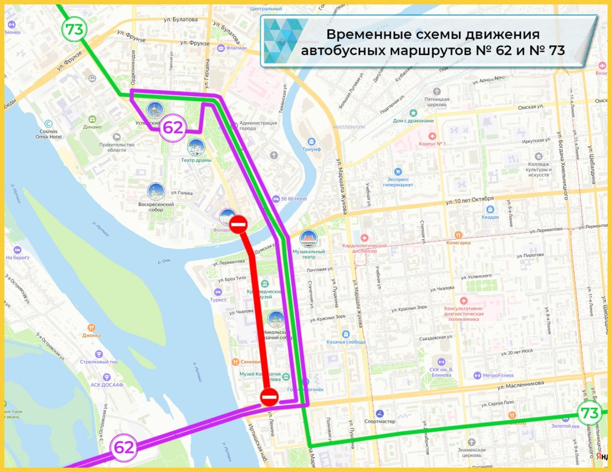 В связи с проведением Всероссийского полумарафона «ЗаБег.РФ» в Омске изменится схема движения общественного транспорта. В период с 10:00 до 15:00 часов 24 мая улица Ленина будет закрыта для любого транспорта на участке от улицы Партизанской до Ленинградской площади. В связи с этим движение общественного транспорта будет изменено: Маршрут № 73: с улицы Красный Путь следует по улицам Интернациональная, Гагарина, Комсомольскому мосту, проспекту Маркса, далее – по установленной схеме движения Маршрут № 62: следует до остановки «КДЦ «Маяковский» по улице Интернациональная, дальше повернет на Соборную площадь, проедет через площадь Победы, затем с правым поворотом на улицу Гагарина, по Комсомольскому мосту, проспекту Маркса, далее – по установленной схеме движения. Фото: Омский Дептранс