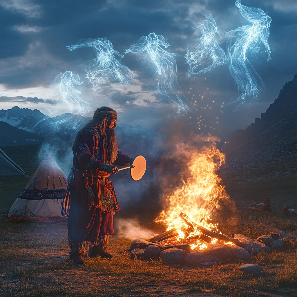 Как-то однажды приехал я к одному большому шаману, по своей надобности. Заранее не договаривался, контактов нет. А у него там обряд идет, посвящают кого-то в шаманы, уже вторые сутки(трое суток обряд идет). Думаю, пойду посмотрю, в хозяйственную зону, туда пройти можно, это в обрядовую зону нельзя входить. Может договорюсь о встрече или телефон дадут. А я в дорогу брал с собой Толи, зеркала, белое и желтое. Когда подъехал к границе стоянки Толи снял, в машине оставил, дальше пешком пошел. А на посвящениях обычно присутствуют несколько шаманов. И вот ко мне сразу двое пошли. Мужчина и женщина пожилая, шаманка. Сразу меня остановили. А мужик спрашивает: «А что у тебя есть еще?» и на грудь мне показывает.. Иначе говоря, он все прекрасно видел и его это ничуть не удивило. Но разговор у нас не сложился по объективным причинам. Я там еще побыл, послушал бубен и уехал. Да я бы задержался, но жене стало плохо, там сильно плотная энергетика, много Духов, Онгонов заводят. Те кто участие принимают и приглашенные, они «под зонтиком», остальным нежелательно там присутствовать.