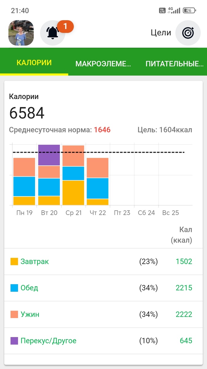 Ура! Я это сделала! Вчера скачала счётчик калорий и внесла всё, что ела эти дни. 👌 Ну не буду томить. Сразу со среднесуточной начну. Питание понедельник-четверг. Вот такая картина. Вчера весь вечер вносила записи. Ну не смертельно. В среду приезжала моя цветочная подруга с новиночками для меня и у меня кое что взять. Привезла детям пакет конфет. Детям.. 😄 В общем, я съела 150 гр.🤦♀️ Моё вчерашнее меню. С утра сделала салат. Яйцо, огурец, щавель, руккола, кинза, укроп, редис. И 45гр майонеза лёгкого. Что бы, смазать так сказать, листики все. Для лучшего скольжения и наслаждения.))) Обедала зелёными щами. Или борщом. Кто так называет. Это когда вместо капусты щавель и яйцо. Ням ням. Пошёл щавелёк. На капусте экономим. 👌😄 Плюс яйцо, свинина без жирка. Хотя я люблю пожирнее кусочки. 😍 Уже молодец, что кусок другой выбрала. ✊ Зато взвесила сала. 10 гр. Ну как, щи, яйцо, зелёный лучок и без граммульки сала? Ну ни как! Не вкусно совсем. Вкус детства. 😄💕 Очень вкусненько. Ужинала к