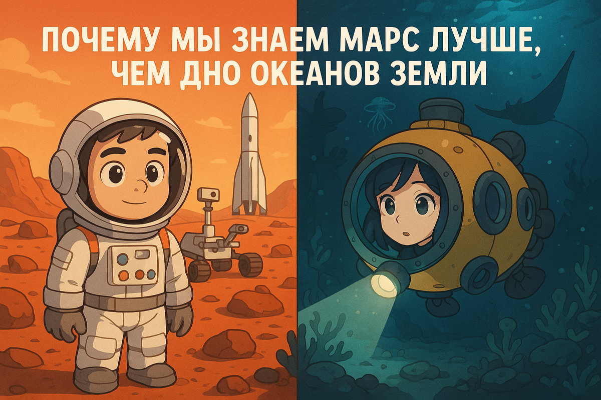 Сначала о хорошем. Точнее, о Марсе. Его поверхность мы изучили настолько дотошно, что там, если что, можно искать потерянные ключи. Спутники, орбитальные зонды, лазеры, дроны, микроскопы — всё в бой. На Марсе уже сейчас есть карты с точностью до полуметра. Это как если бы мы умели рассматривать каждый бордюр в чужом городе, но до сих пор не знали, где заканчивается собственный подвал. Почти вся марсианская поверхность — покрыта детальными снимками. Учёные там в пикселях могут сказать, где когда-то текла вода, где был оползень, а где просто гора прикинулась холмом. Короче, Марс мы видим как на ладони. А теперь — держитесь. А теперь к нам домой. На планету Земля. У нас, на минуточку, 70% поверхности — океаны. Но вот что забавно: мы с трудом картографировали даже треть морского дна. Остальное — белое пятно. Нет, даже не белое — чёрное. Потому что темно, холодно, давление как на фоне увольнения, и вообще — не до исследований. Секрет прост: сквозь воду спутник не видит. А чтобы «прозвонить