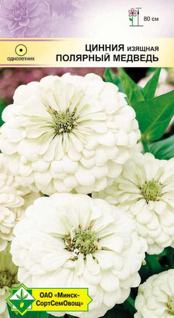 Цинния "Полярный медведь" – это однолетнее растение с крупными махровыми соцветиями белого цвета с легким зеленоватым оттенком. Высота куста достигает 80 см, а диаметр цветков – 11-14 см. Благодаря прочным стеблям растение не требует подвязки, что упрощает уход.